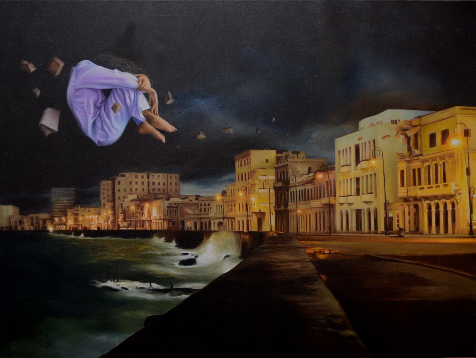 Blending elements from Willy Chirino’s Ya Viene Llegando and Picasso’s Guernica, this piece embodies the immigrant experience. A lone child sits on a precarious chair, suspended between past and future, gazing toward a hopeful sunrise. A toy and paper boat symbolize innocence and journey, while a measuring tape and arrow mark the distance between where he’s been and where he’s headed. A poignant reflection on loss, hope, and resilience, this painting invites you to ask where do you come from, and what story does your journey tell?